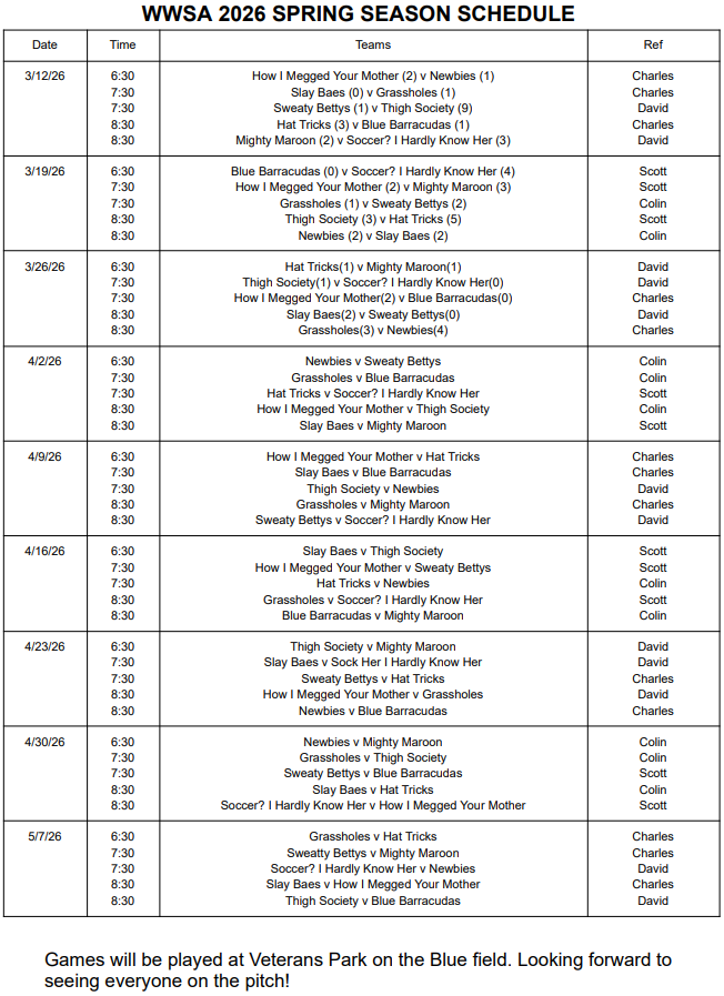 All games will be played at Veterans Park on the Blue fields.